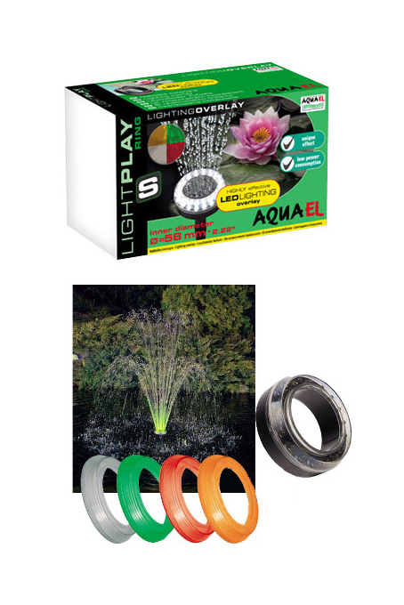 Световые кольца (LightPlay Rings), устанавливаются на фонтанных насадках. Источником света являются диоды LED. В комплект входят четыре цветных фильтра, позволяющих получить различные цветовые эффекты. В ассортименте две модели:«S» для насадок к насосам«PFN 1100-3500» и «L» – для насадок к насосам «PFN7500-10000». - уникальный, длительный эффект - диоды не нуждаются в замене - небольшое потребление мощности и безопасное напряжение 12 V - длина кабеля 10 м.