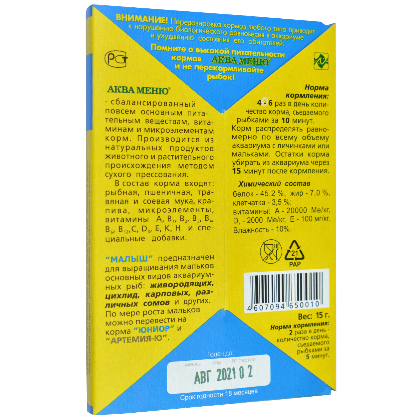 "Малыш" - универсальный корм для выращивания мальков основных видов аквариумных рыб: живородящих, цихлид, карповых, различных сомов и др. По мере роста мальков можно перевести на корма "Юниор" или "Артемия-Ю". Вес: 15г