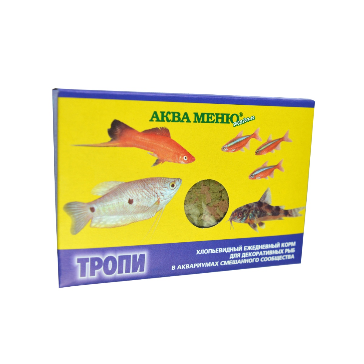 "Тропи" - хлопьевидный ежедневный корм для большинства видов аквариумных рыб: живородящих, цихлид, харациновых, лабиринтовых, карповых, различных сомов и других рыб средних размеров. Усиливает естественную окраску рыб. Подходит для аквариумов "смешанного сообщества". Вес: 11г.