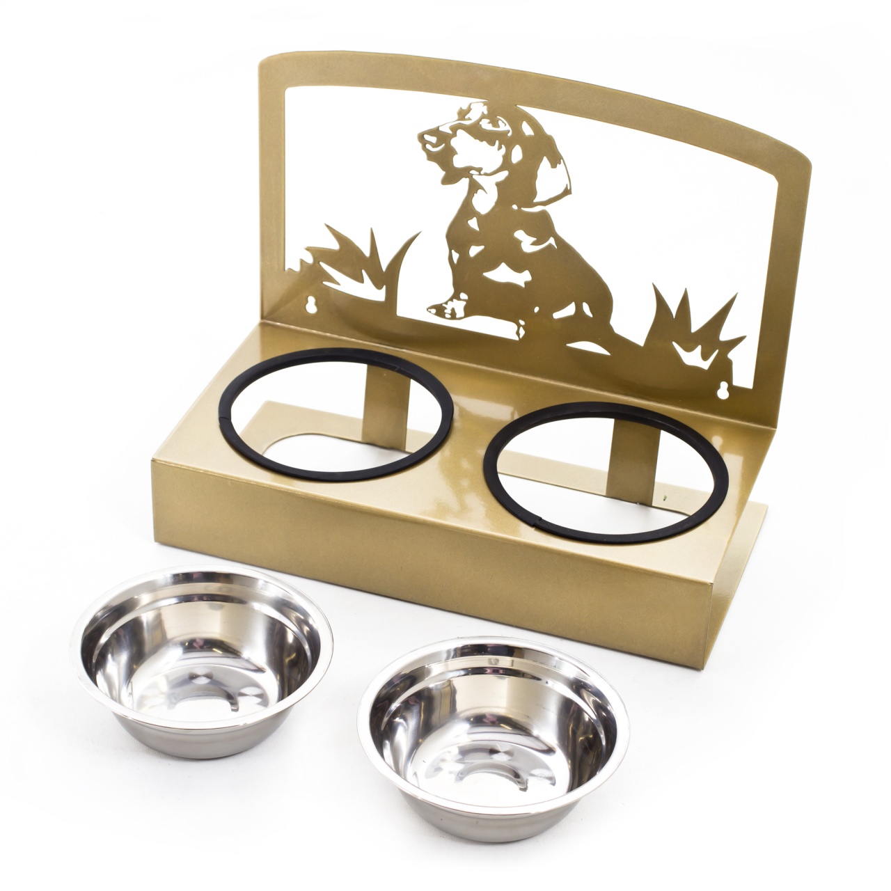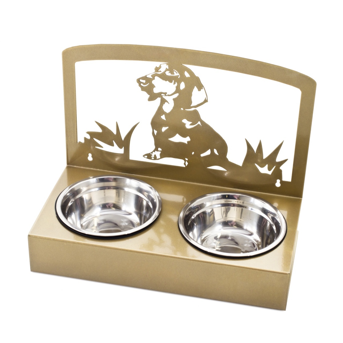 Металлическая подставка с 2-мя мисками, с симпатичным узором в виде таксы. Напольная, с возможностью крепления к стене. Подходит для кошек и собак.