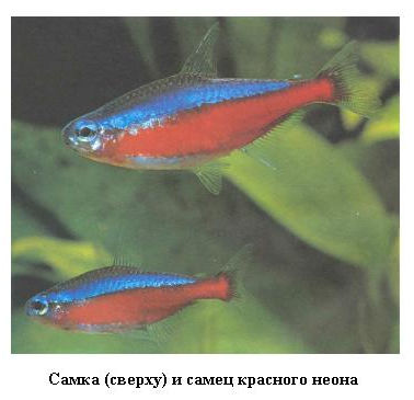 А вот процесс размножения красного неона несколько отличен от нереста голубого неона. Подготовительный этап – стимуляция нереста красного неона – ничем не отличается от подготовки неона обыкновенного. Основное отличие касается последующего этапа – пересадка самцов и самок в общий нерестовик – резкое повышение температуры до 30°C с постепенным понижением ее до 24-25°C к ночи.