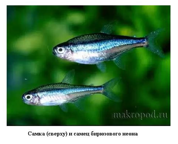 Говоря о красном и голубом неоне, нельзя не упомянуть о третьем виде этого рода – неоне бирюзовом (Paracheirodon simulans), который в литературе встречается под такими названиями как «синий неон», «неон ложный». Впервые подробное описание бирюзового неона дал Жак Гери (Gery) в 1963 году.