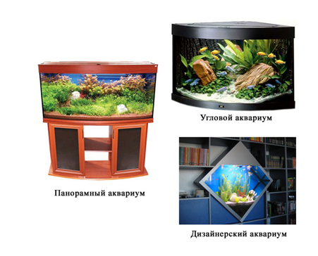 Все формы аквариумов можно сгруппировать по видам: панорамные, угловые, дизайнерские. Панорамные аквариумы обеспечивают максимально выигрышный обзор для человека, не пренебрегая «жилищными» условиями подводных обитателей. Угловые аквариумы являются особо удачным решением для небольших помещений, так как при внешней зрелищности занимают минимальное пространство. Дизайнерские аквариумы являются, прежде всего, эффектным элементом интерьера, а не «домом» для его обитателей. К ним относятся настенные аквариумы; аквариумы, встраиваемые в журнальные столики, кресла, лестницы; аквариумы-колонны и другие. Некоторые формы аквариумов могут относиться сразу к двум видам. Например, угловой и панорамный или встраиваемый (дизайнерский) и панорамный.