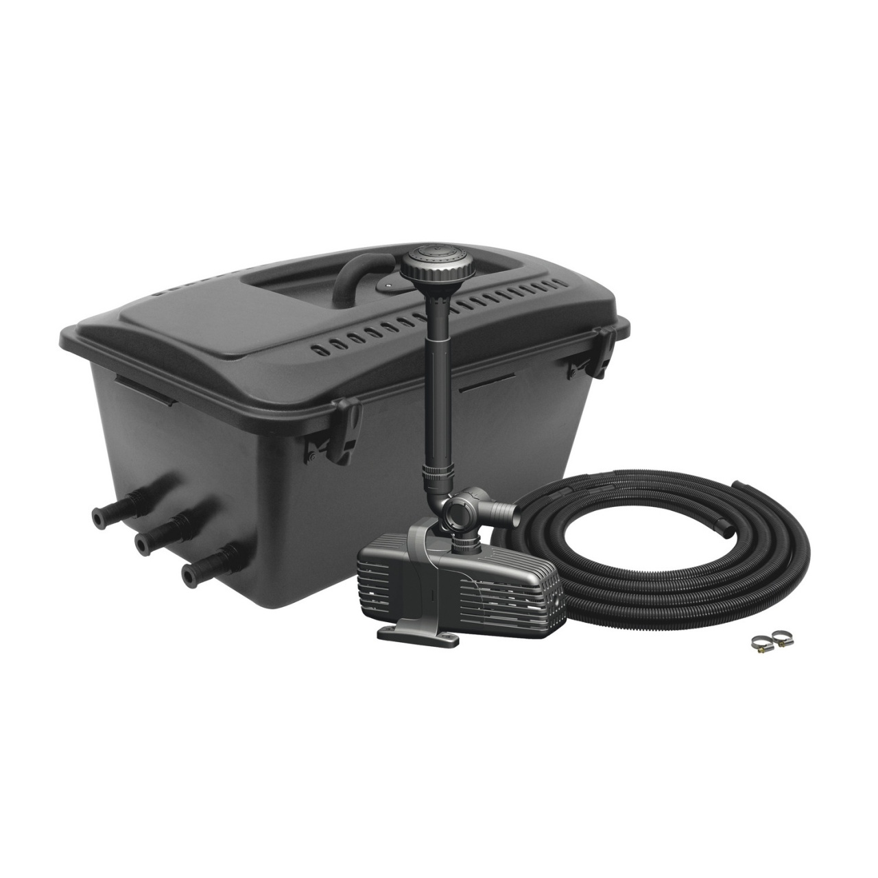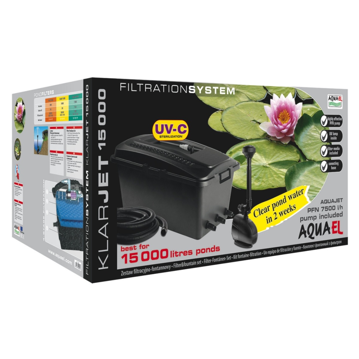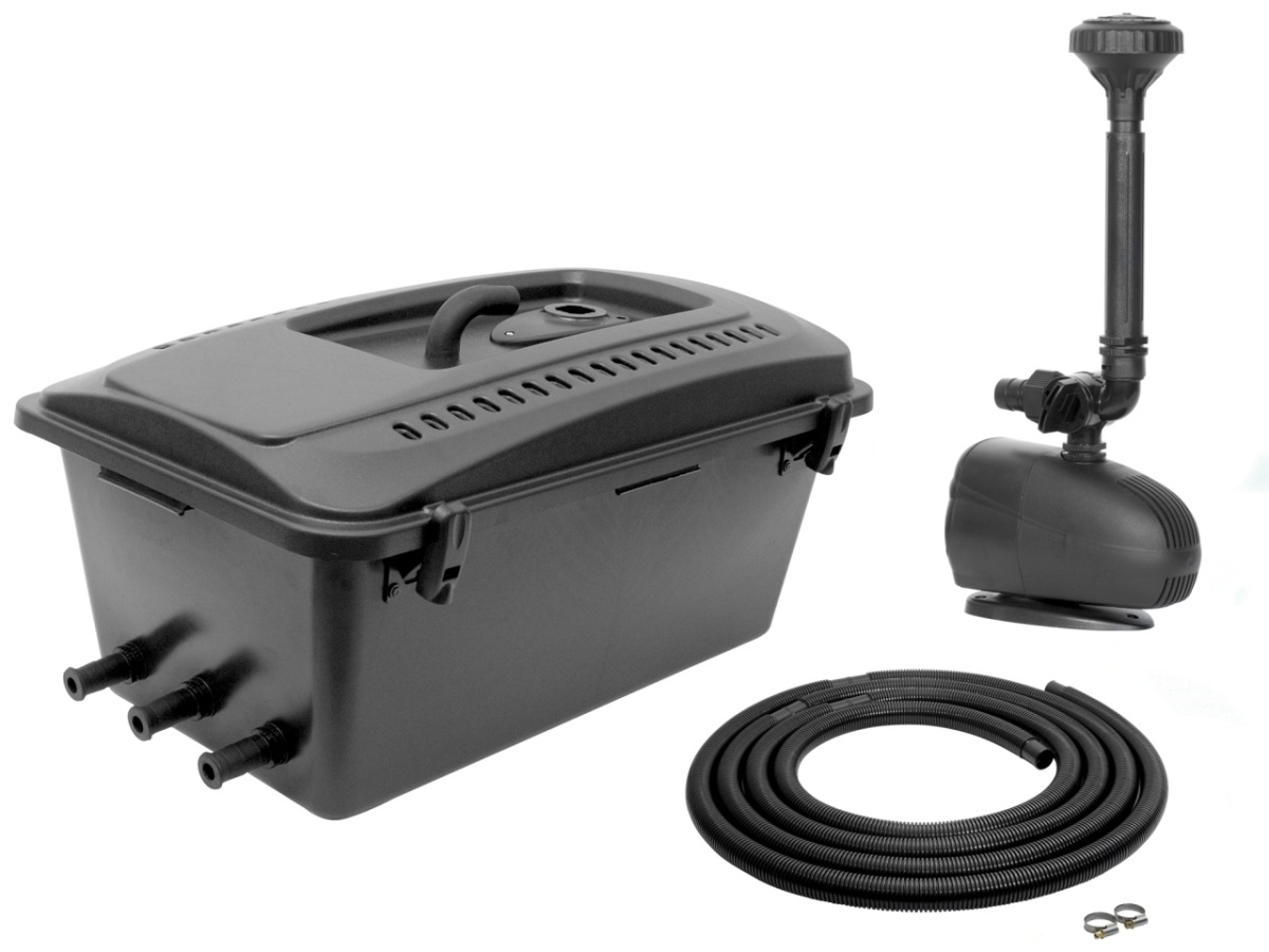 Прудовой комплект KLARJET 15 000: фильтр, помпа с фонтанной насадкой, UV - стерилизатор, шланг - для пруда объемом до 15 000л Технические характеристики: - Стерилизатор (в комплекте): 5 Вт - Объем пруда: до 15 000 л - Диаметры шлангов : 3/4 дюйма