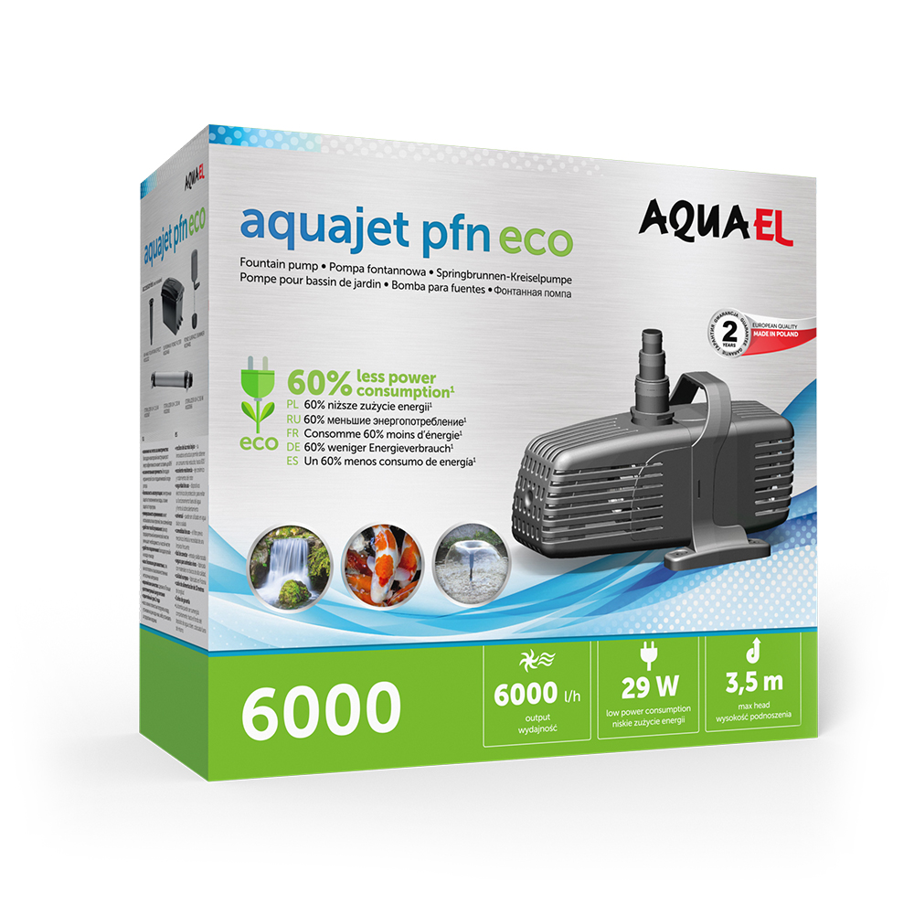 AQUAEL AQUAJET PFN ECO - это современные энергосберегающие фонтанные насосы. Их отличает высокая производительность, универсальность в применении, эстетичный внешний вид и удобство в использовании. Благодаря уникальной конструкции роторной камеры, насосы AQUAJET PFN ECO потребляют до 60% меньше электроэнергии по сравнению с насосами PFN предыдущего поколения той же производительности.