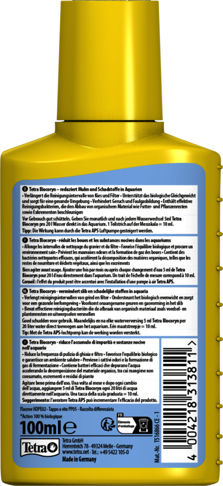 Сокращает количество осадков и вредных веществ в аквариуме. Увеличивает интервал между процедурами очистки грунта и фильтра. Предотвращает появление неприятных запахов. Содержит бактерии, ускоряющие разложение органических веществ. Хорошо встряхнуть перед применением. Добавлять 5 мл на 20 л аквариумной воды ежемесячно или после каждой подмены непосредственно в аквариум. Одно деление на измерительной шкале соответствует 10 мл. Эффект от применения препарата можно улучшить, используя компрессор.