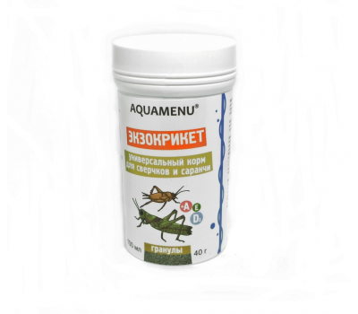 "Экзокрикет" -сухой корм в виде мелких гранул для сверчков, саранчи и других насекомых. Содержит полезные вещества, способствующие питанию и витаминизации кормовых беспозвоночных. Увеличивает питательную ценность кормовых насекомых и помогает продлить срок их жизни во время передержки. Сухой корм в виде мелких гранул для сверчков, саранчи и других насекомых. Содержит полезные вещества, способствующие питанию и витаминизации кормовых беспозвоночных. Увеличивает питательную ценность кормовых насекомых и помогает продлить срок их жизни во время передержки. Перед скармливанием насекомых, рекомендуется опылить их минеральными добавками Aquamenu Экзокальций или Экзокальций D3. Размер гранул 1-2 мм. Рекомендации по кормлению: насыпать небольшое количество корма в кормушку инсектария. Добавлять корм по мере его поедания насекомыми. У насекомых должен быть постоянный доступ к свежей воде или сочным кормам.