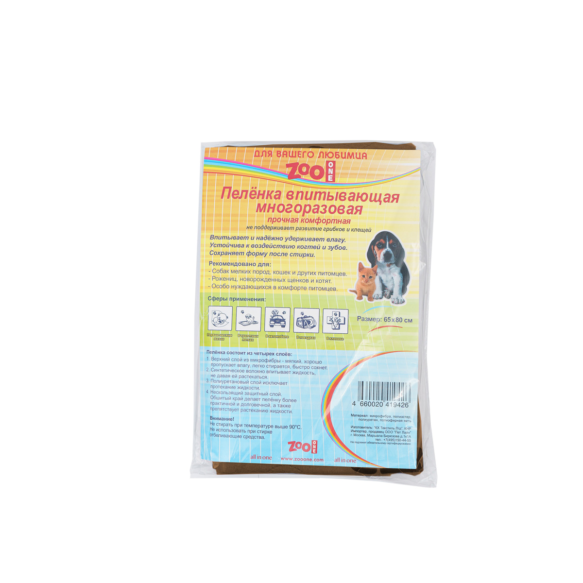 Прочная комфортная. Не поддерживает развитие грибков и клещей. Рекомендовано для собак, кошек и всех видов домашних питомцев. Используются как комфортные впитывающие подстилки в туалетных лотках, в переносках, в автомобиле. Впитывает и надёжно удерживает влагу. Устойчива к воздействию когтей и зубов. Многоразовые пеленки состоят из четырёх слоёв:
